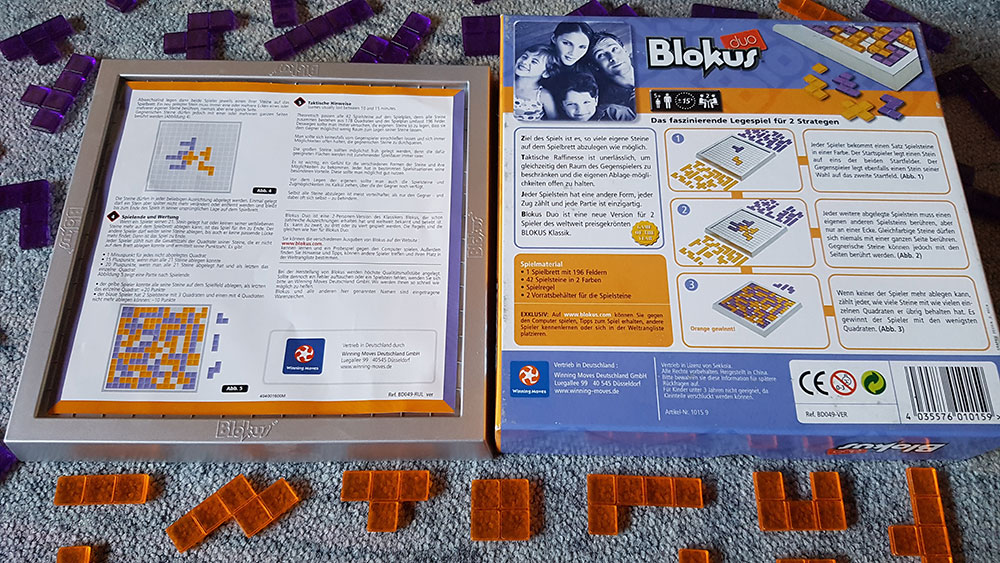 Für viele war es nur eine Frage der Zeit, wann Blokus Duo endlich erscheint. Fakt ist, daß Blokus selber für andere Zusammensetzungen, als 4 Spieler nicht wirklich gut funktionierte und es somit leider nur in dieser Gruppengröße gespielt werden konnte. Somit war die Idee ganz einfach - Wir ändern so wenig wie nötig und bringen so viel Spielspaß wie möglich von der 4-Spieler-Version in die 2-Spieler-Version rüber. Das Spielziel bleibt gleich und lautet auch heute wieder: Möglichst viele Teile ablegen und möglichst wenig Quadrate auf der Hand behalten - ganz wie es von Blokus bekannt ist.