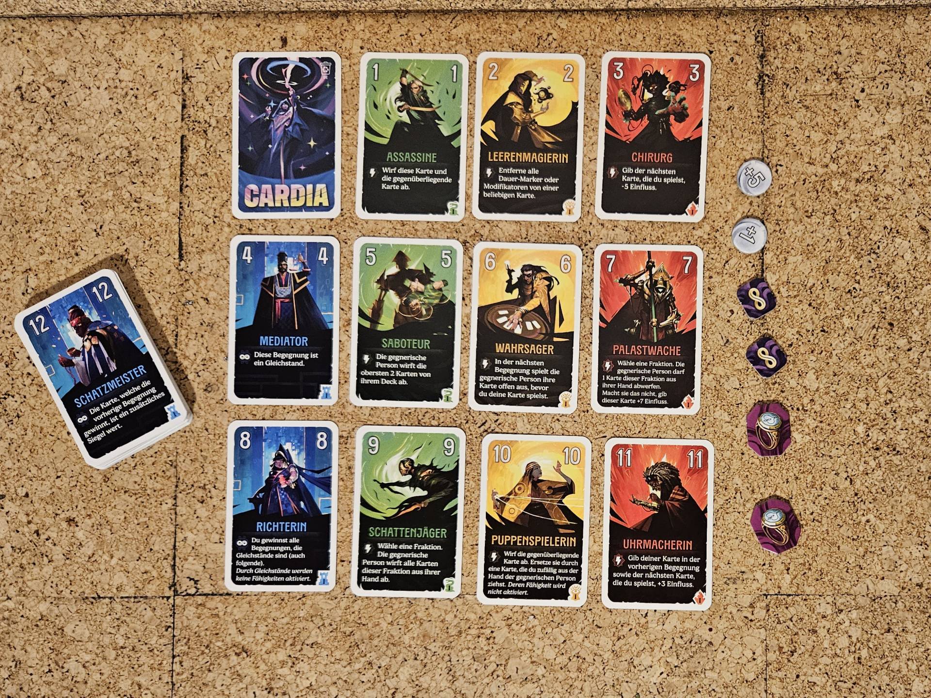 Im Kennerspiel Duell um Cardia tretet ihr in einem epischen Wettstreit gegeneinander an, um mächtige Siegelringe und die Gunst der vier Fraktionen für euch zu gewinnen. Spielt eure Karten zum richtigen Zeitpunkt aus, setzt ihre Fähigkeiten klug ein und überlistet euer Gegenüber, um die wahre Herrschaft über Cardia zu erlangen.