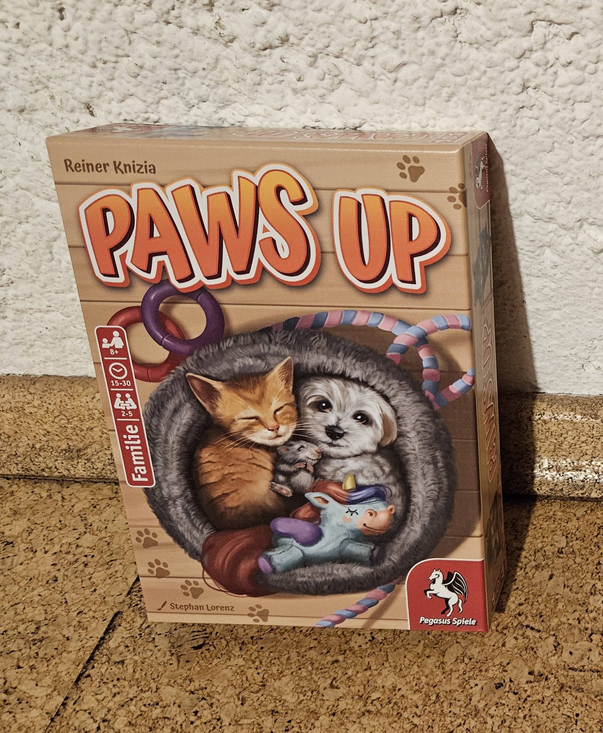 Im Kartenspiel Paws Up ertauschen sich die Spielenden Runde um Runde neue Tierfotos. Dazu spielen sie immer eine Handkarte aus und tauschen diese gegen eine der ausliegenden Karten ein. Die ausgespielte Handkarte mit dem höchsten Pfötchenwert beginnt die Tauschrunde und kann sich so die begehrteste Karte aus der Auslage sichern. Doch das muss nicht immer die Karte mit den meisten Pfötchen sein, denn auch Trends wollen mit hochkarätigen Story-Postings bedient werden. Wer hier am schnellsten eine angesagte Story aus drei passenden Tierfotos zusammenstellt, kann sich zusätzliche Pfötchen für die Punktewertung sichern. Wer nach 13 Runden die meisten Pfötchen über Handkarten und erstandene Storykarten für sich zählen kann, hat sich den Titel als neuer Social-Media-Star verdient.