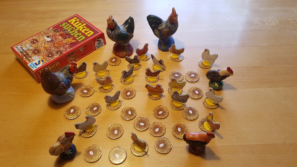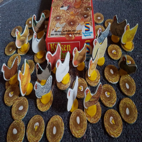 Auf dem Hühnerhof ist einiges los, es ist ein einziges gegackere und Gepiepse. Überall sitzen Hennen auf ihren Nestern und brüten Eier aus. Und siehe da, die ersten Küken schlüpfen auch schon. Doch unter welchen Hennen stecken die Küken denn nun? Wer am Ende die meisten Küken sammeln konnte, ist Sieger.