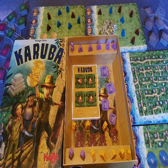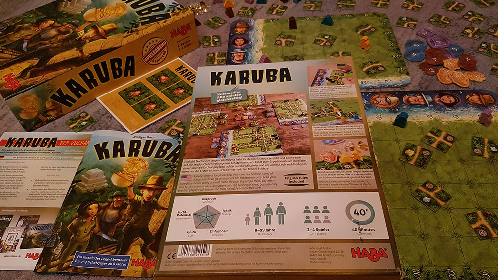 Endlich! Nach einer langen Schiffsreise haben die Schatzjäger die Insel Karuba erreicht und können sich auf die Jagd nach den verborgenen Schätzen machen. Wer führt sein Expeditionsteam möglichst clever über die Dschungelpfade, achtet auf die Mitspieler und hält die Augen nach Gold und Kristallen am Wegrand offen? Doch am wichtigsten ist es, rechtzeitig loszulaufen! Denn die Ersten sichern sich die wertvollsten Tempel-Schätze.